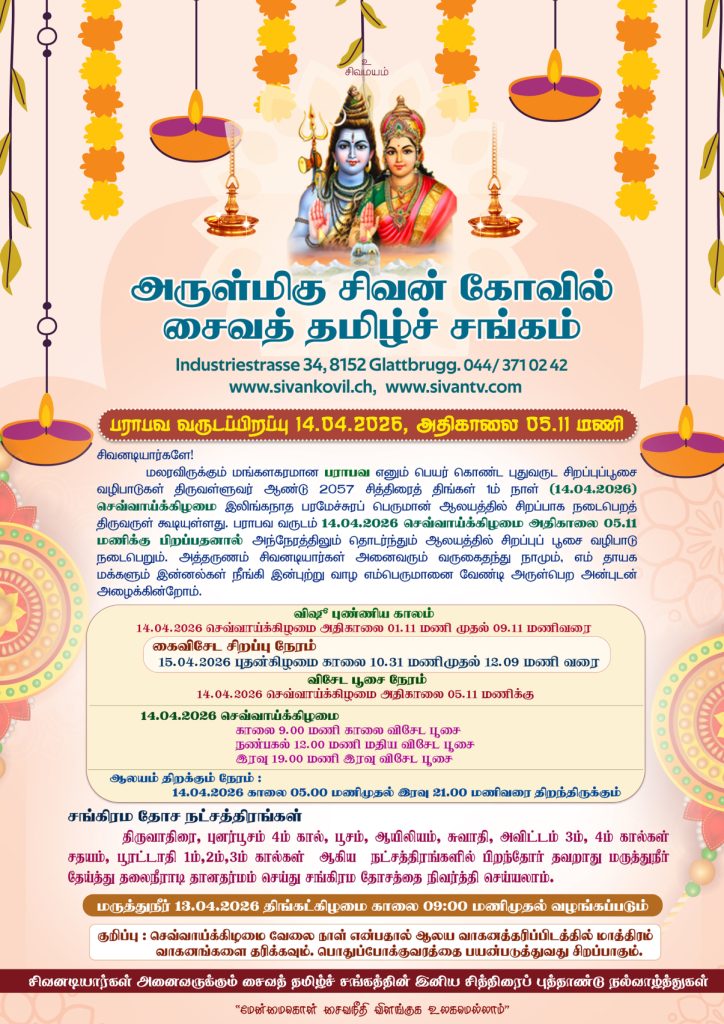 மலரவிருக்கும் மங்களகரமான பராபவ எனும் பெயர் கொண்ட புதுவருட சிறப்புப்பூசை வழிபாடுகள்; திருவள்ளுவர் ஆண்டு 2057 சித்திரைத் திங்கள் 1ம் நாள் (14.04.2026) செவ்வாய்க்கிழமை இலிங்கநாத பரமேச்சுரப் பெருமான் ஆலயத்தில்; சிறப்பாக நடைபெறத் திருவருள் கூடியுள்ளது. பராபவ வருடம் 14.04.2026 செவ்வாய்க்கிழமை அதிகாலை 05.11 மணிக்கு பிறப்பதனால் அந்நேரத்திலும்; தொடர்ந்தும் ஆலயத்தில் சிறப்புப் பூசை வழிபாடு நடைபெறும். அத்தருணம் சிவனடியார்கள் அனைவரும் வருகைதந்து நாமும், எம் தாயக மக்களும் இன்னல்கள் நீங்கி இன்புற்று வாழ எம்பெருமானை வேண்டி அருள்பெற அன்புடன் அழைக்கின்றோம்.