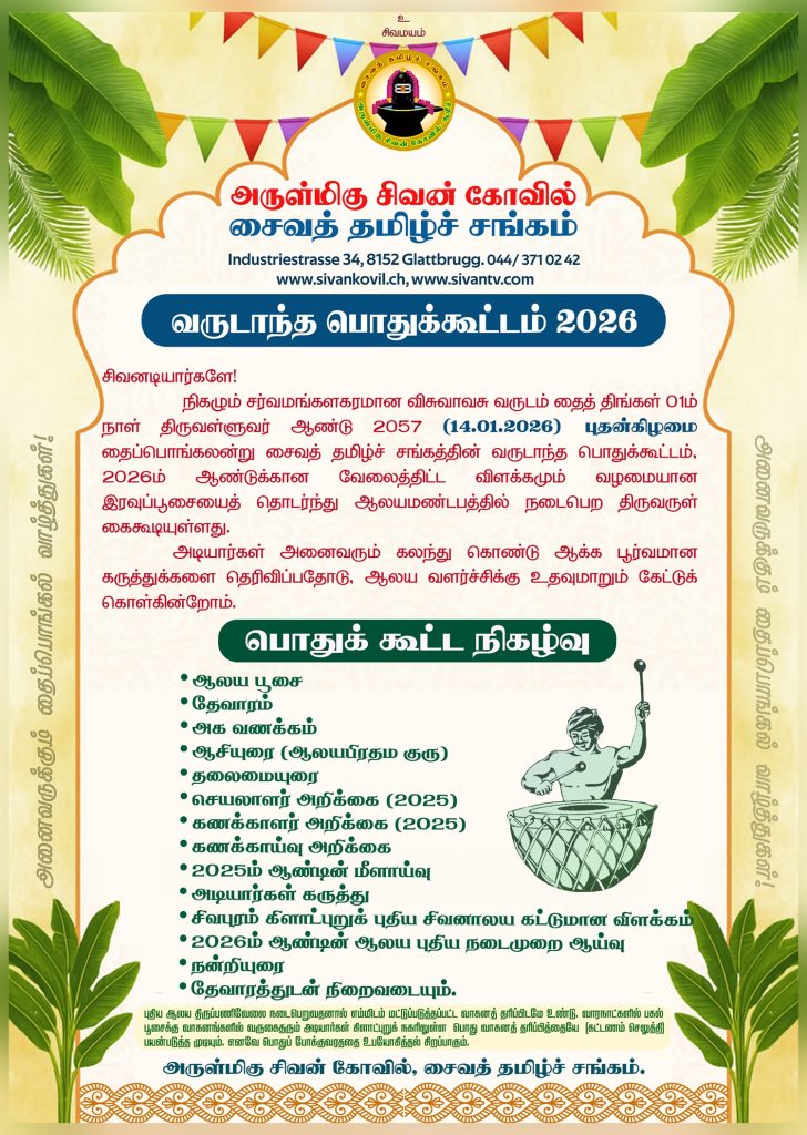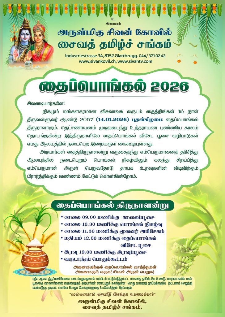 நிகழும் சர்வமங்களகரமான விசுவாவசு வருடம் தைத் திங்கள் 01ம் நாள் திருவள்ளுவர் ஆண்டு 2057 (14.01.2026)